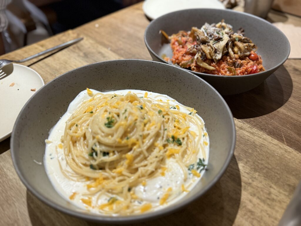 Very, very cheesy. It can get a little heavy towards the end, but paired with the risotto, which had a hint of sourness, it balanced out nicely. Personally, I love creamy, cheesy pasta (it’s basically how I make all my pasta at home), but for some, this might be a little much.